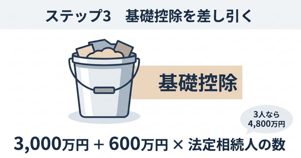 バケツに残った財産から、さらに大きな金額を差し引きます 。 それが、国が認めてくれている非課税のボーダーライン「基礎控除」です