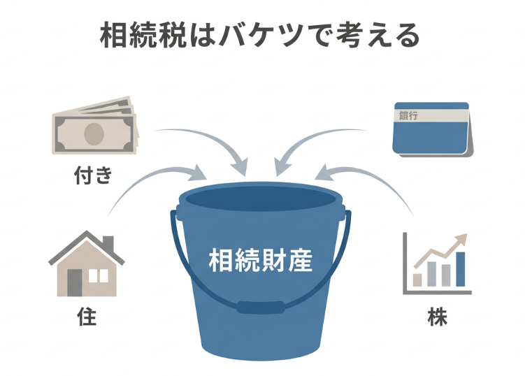 まず、亡くなった方の財産をすべてバケツに入れるところからスタートします 。 現金、預金、不動産、株など……